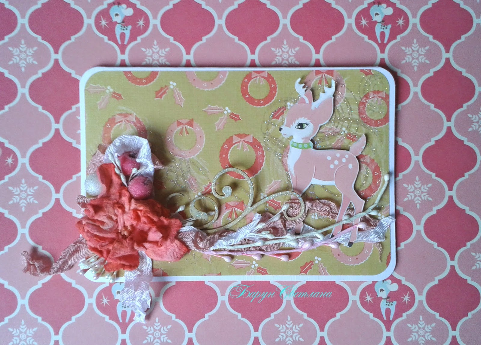 Новогодняя открыточка. Тут я использовала чипборд от LAE. Я покрыла его пудрой для эмбоссинга с блестками, очень хорошо легло. Чипборд качественный, а завитки довольно универсальны!